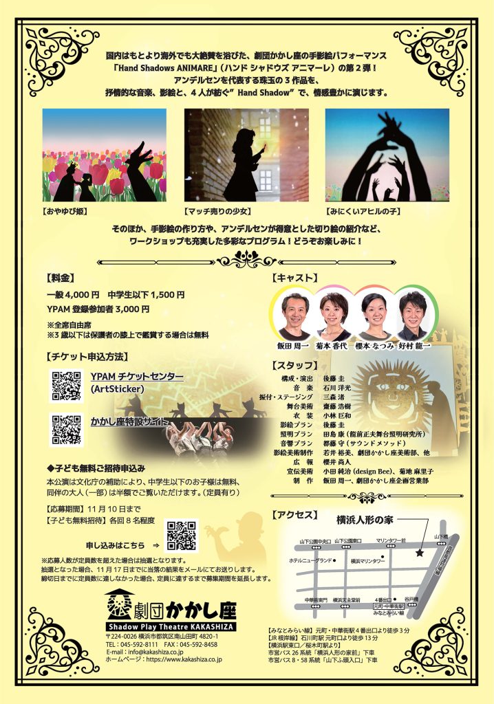 国内はもとより海外でも大絶賛を浴びた劇団かかし座の手影絵パフォーマンス『Hand Shadows ANIMARE』(ハンド シャドウズ アニマーレ)の第2弾!アンデルセンを代表する珠玉の3作品を、抒情的な音楽、影絵と、4人が紡ぐ “Hand Shadow” で感情豊かに演じます。