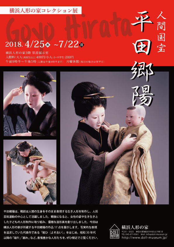 今回は横浜人形の家が所蔵する平田郷陽の作品17点を展示します。写実的な表現を追求していた代表作である「粧ひ(よそおい)」をはじめ、昭和30年代以降の「端午」「戯れ」など、表情豊かな人形たちを、ぜひ間近でご覧ください。