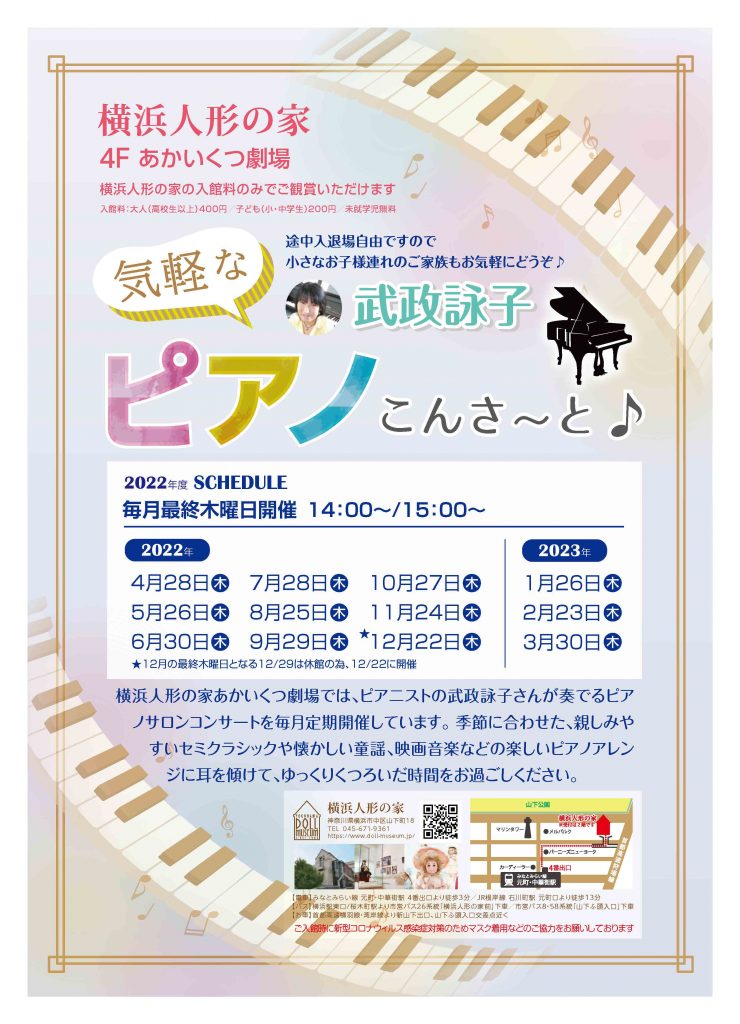 横浜人形の家あかいくつ劇場では、ピアニストの武政詠子さんが奏でるピアノサロンコンサートを毎月定期開催しています。
