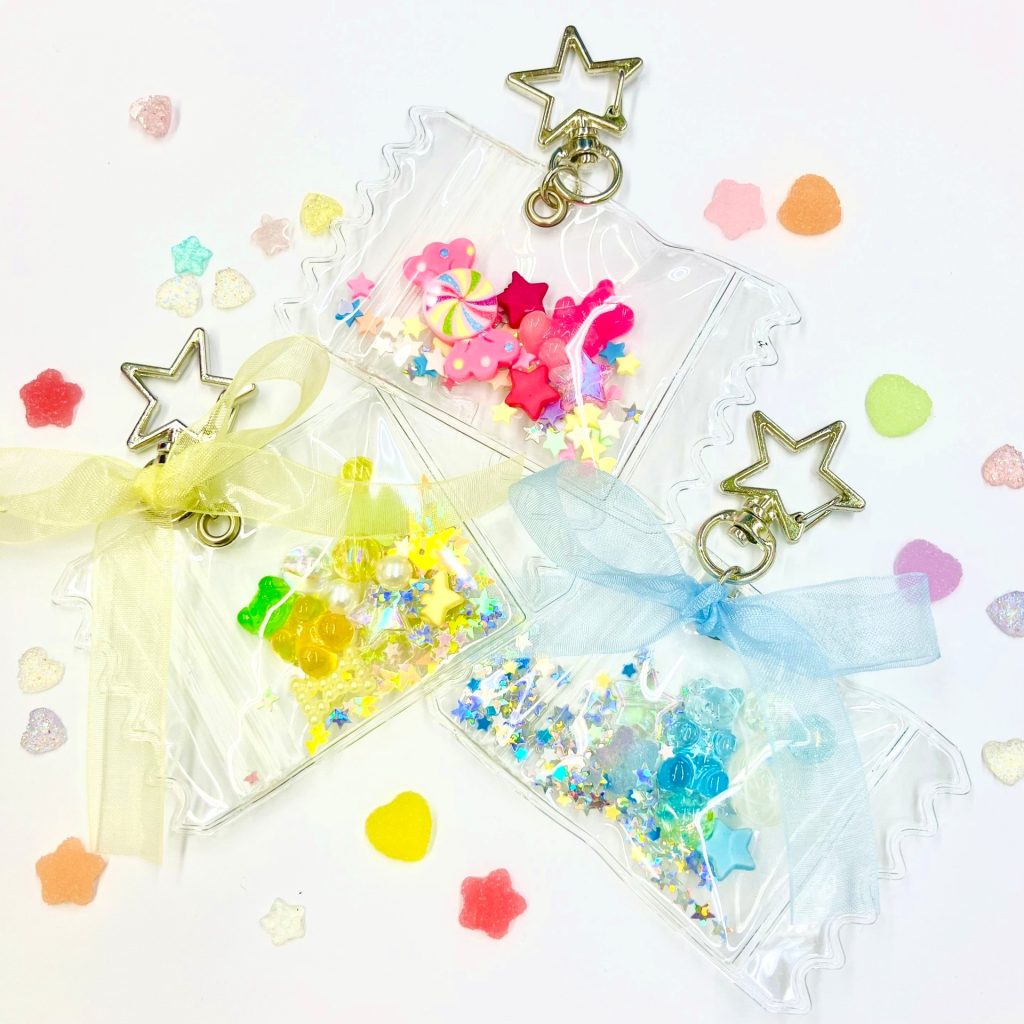 レプリカのくまのキャンディーやお菓子パーツ、キラキラビーズやスパンコールを詰め込んで、シャカシャカ楽しいキーホルダーをつくりましょう!